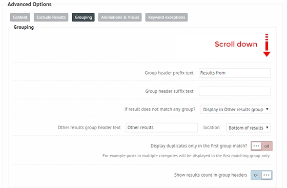 When having multiple content types as results: posts, attachments, users, tags etc.. this option allows separating them into groups.