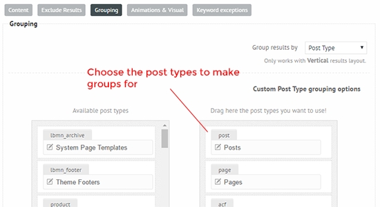 NOTE 1: If a post type does not belong to any of the selected groups, then it's either moved to the 'Other results' group or is removed, depending on how you configure it.