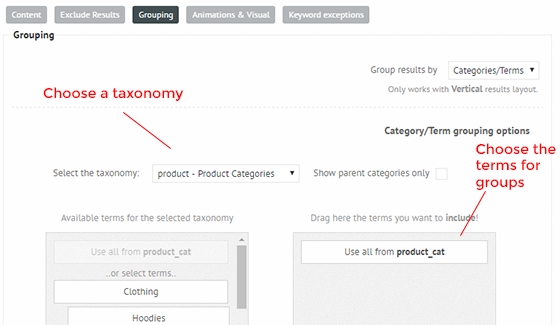 NOTE: If a post type does not belong to any of the selected category groups, then it's either moved to the 'Other results' group or is removed, depending on how you configure it.