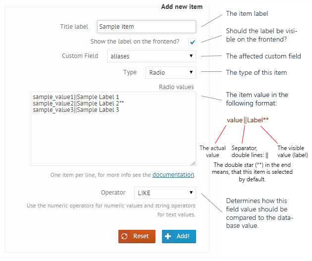 In this case each line represents one radio button. Each radio button must have a value and a label, so the syntax is the following:
