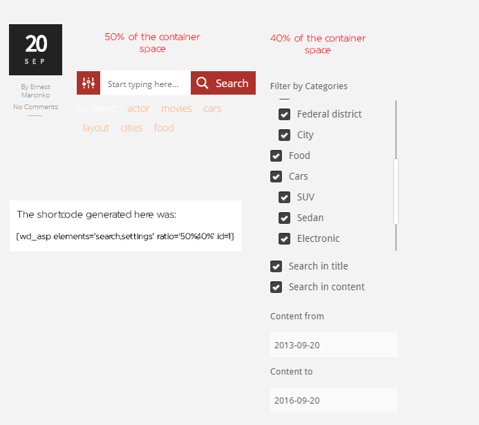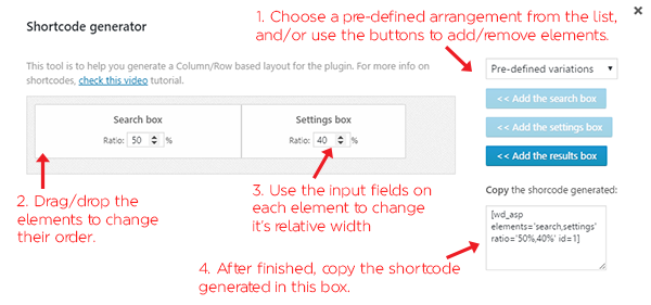 The shortcode generator helps you to create a specific arrangement for search elements. It's a great tool if you need to display the search box, the settings box and the result box in a specific way.