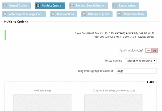 Under the Blogs option, there is a drag-and-drop module, which allows choosing the multisite blogs, you want to search across. By default, the currently active blog will be used.