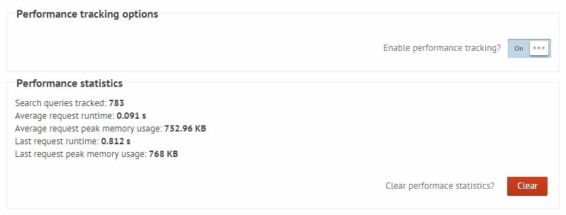 As of version 4.0 a simple ajax performance tracker is introduced. This tracker will measure the run time and the peak performance of the search function.
