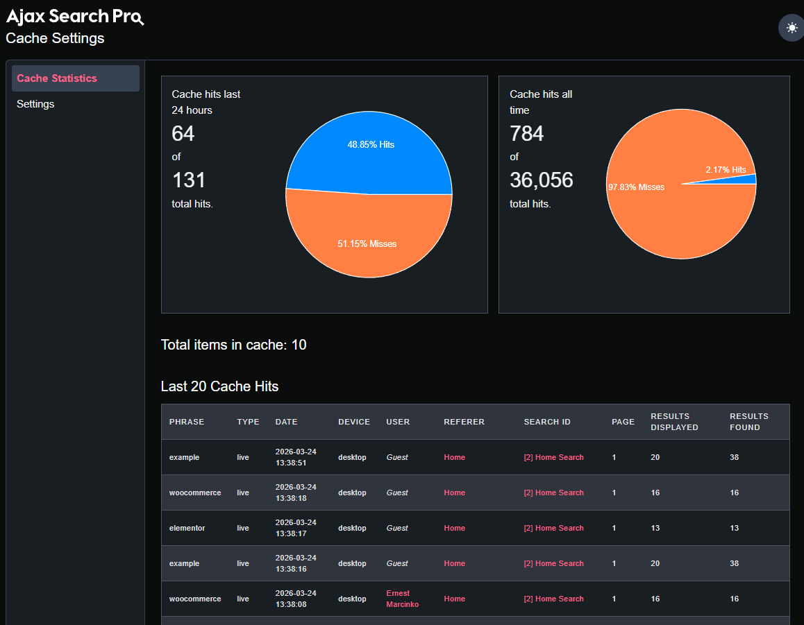 The cache statistics is integrated with the [Search Statistics](https://documentation.ajaxsearchpro.com/search-statistics) feature. To record cache stats, make sure the [search statistics is also enabled](https://documentation.ajaxsearchpro.com/search-statistics#enable-search-statistics).