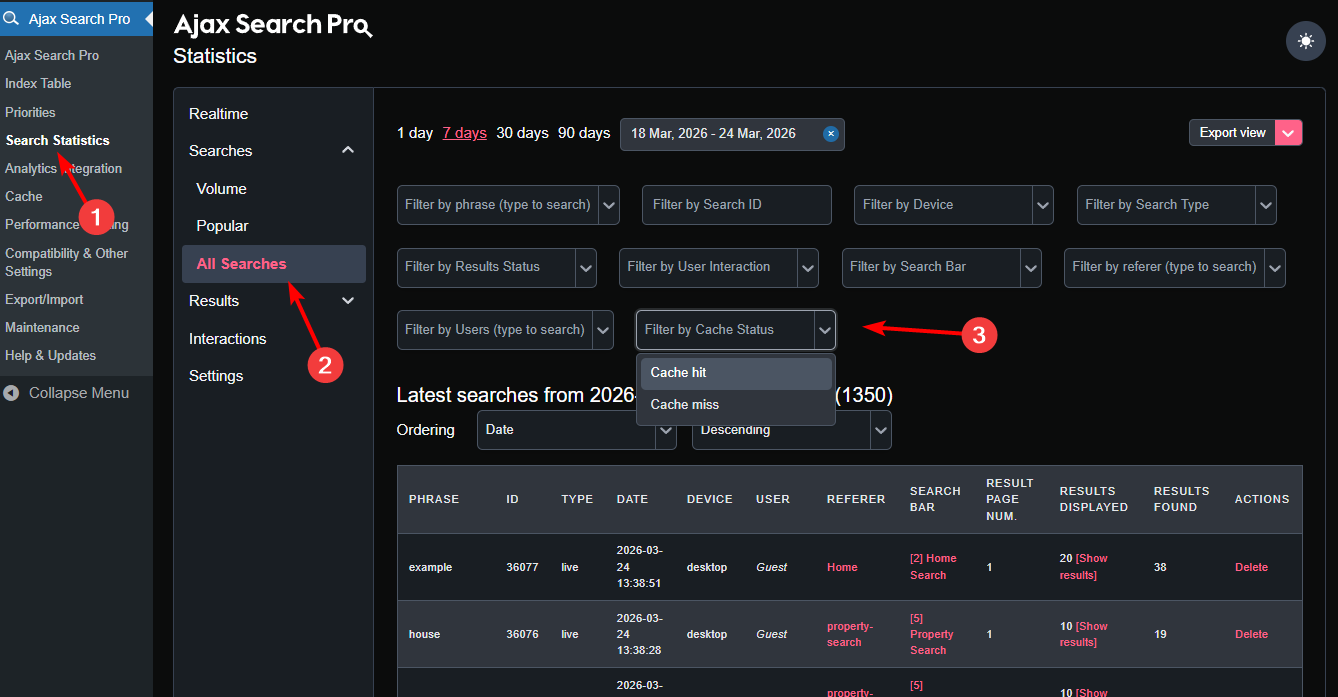 If you want to see more details, then navigate to the **Search Statistics** submenu, where you can use the Cache Status filter on All Searches for more details statistics.